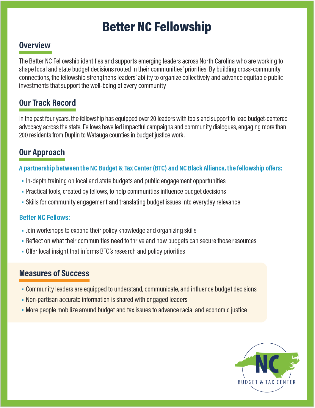 A fact sheet about the Better NC Fellowship, including our approach and how we measure success.