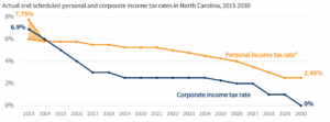 Since 2013, legislative leaders in the NC General Assembly have chosen profitable corporations and the wealthy few over North Carolina’s people, homegrown businesses, and future generations by passing laws that eliminate the state corporate income tax and steadily cut the personal income tax rate.