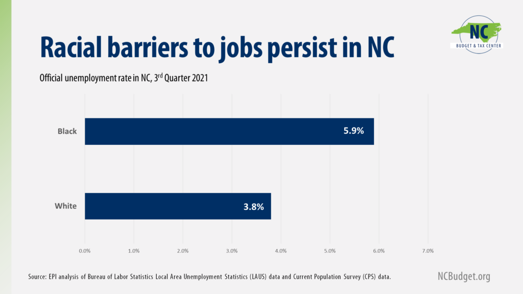 With the main unemployment rate under 4 percent, it may seem like everyone who wants a job can find one. But that’s not the reality for a lot of people, particularly workers of color. As we saw in the aftermath of the Great Recession, economic downturns often last longer for people of color than their white colleagues. We don’t have data through the end of last year yet, but in the 3rd quarter of 2021, the unemployment rate for Black job seekers in North Carolina was still at 5.9 percent, compared to only 3.8 percent for white people.